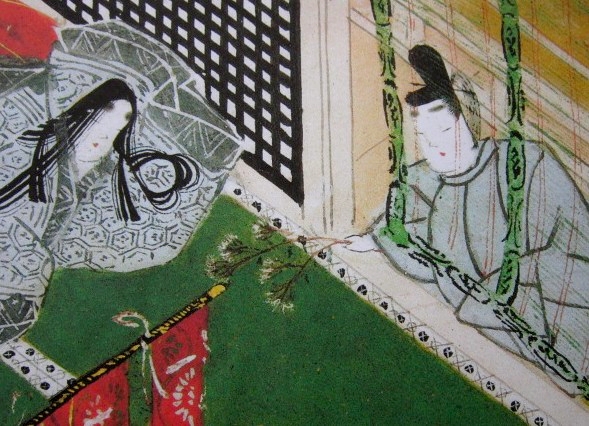 御簾(みす) から藤袴 の花を差し入れながら、